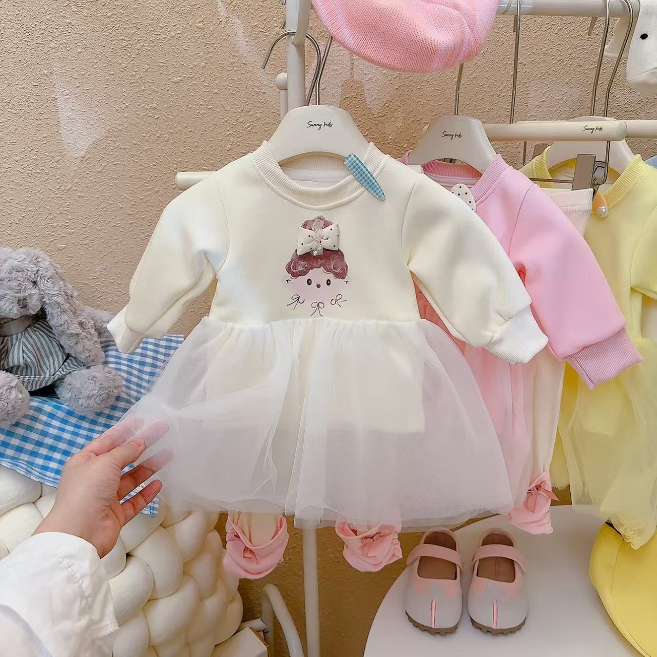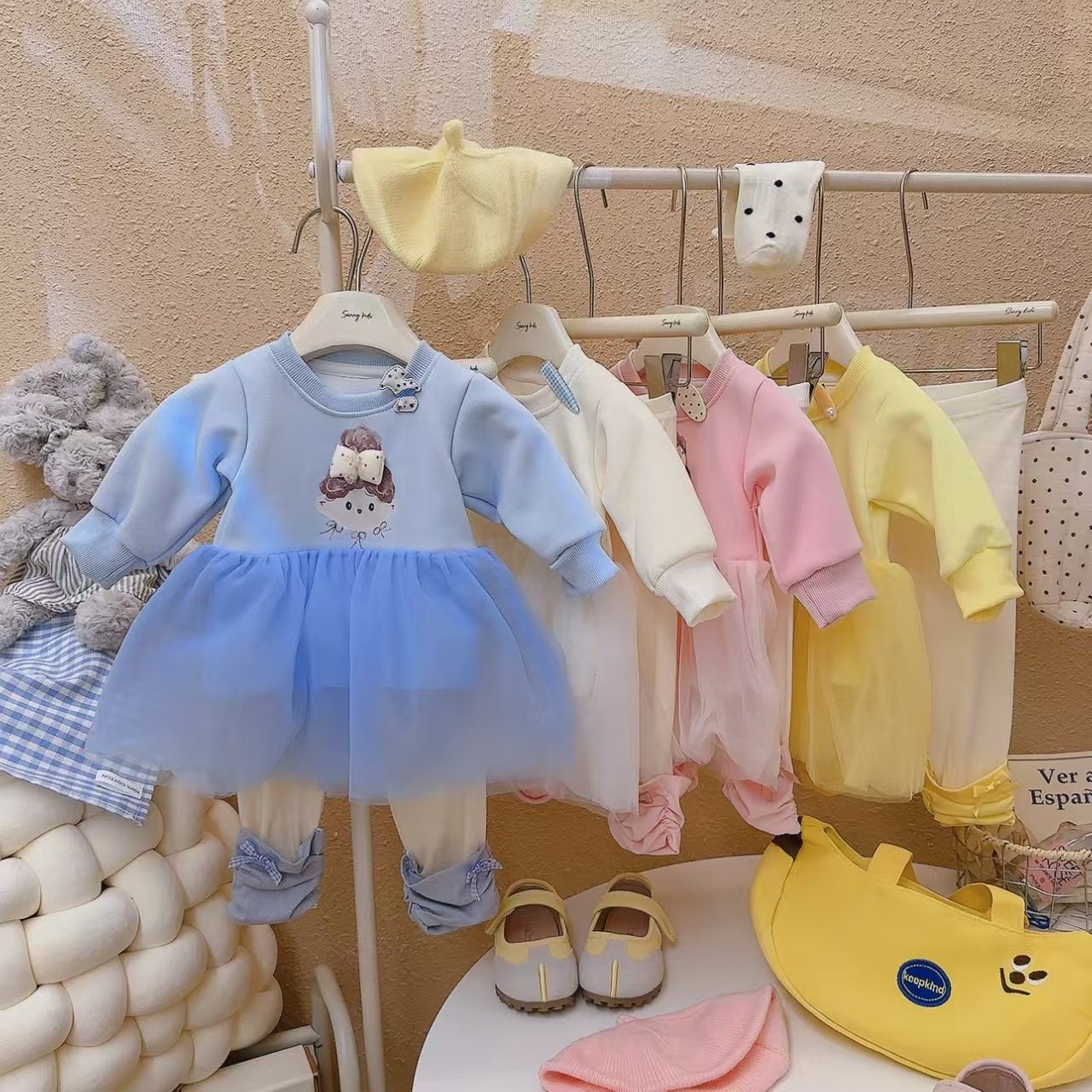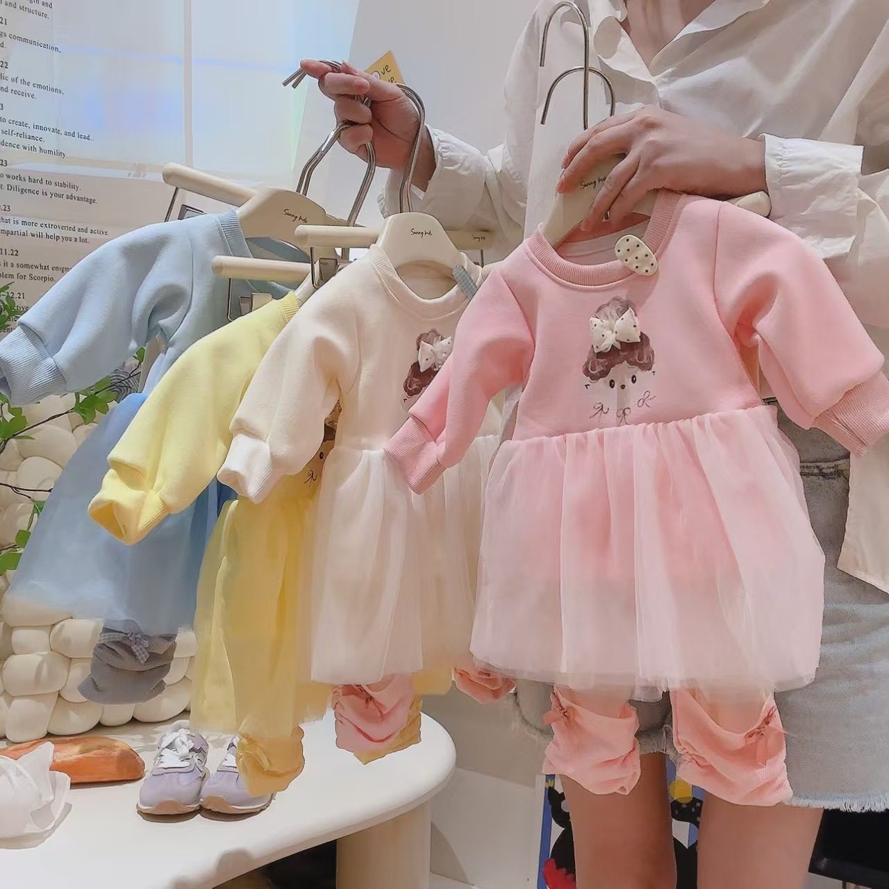 Girls' Cartoon Set, New Autumn Baby Mesh Patchwork Hoodie & Stacked Leggings Two-Piece Outfit