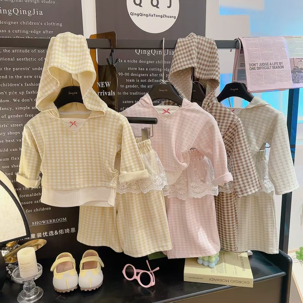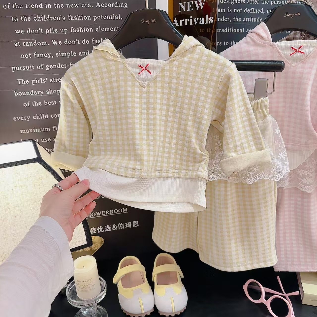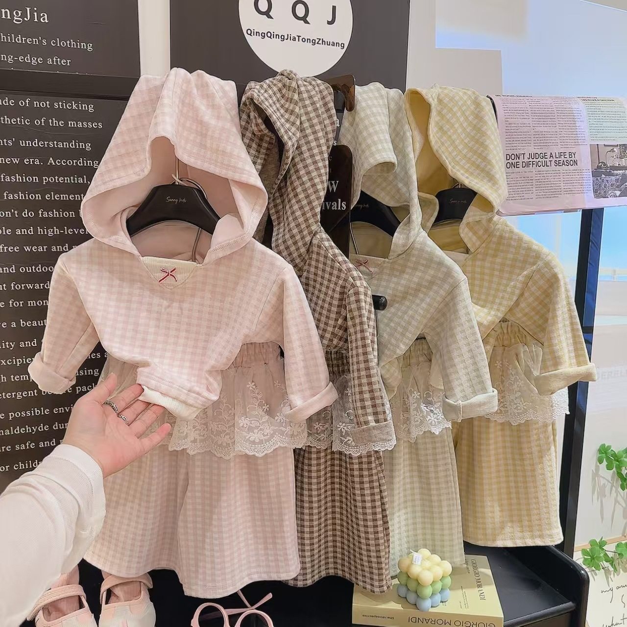 Herbst-Neuheit-vielseitige Spitzenrüschenhose & Langarm-Kapuzen-Süße-Dame-Karo-Top-Spitzen-Set