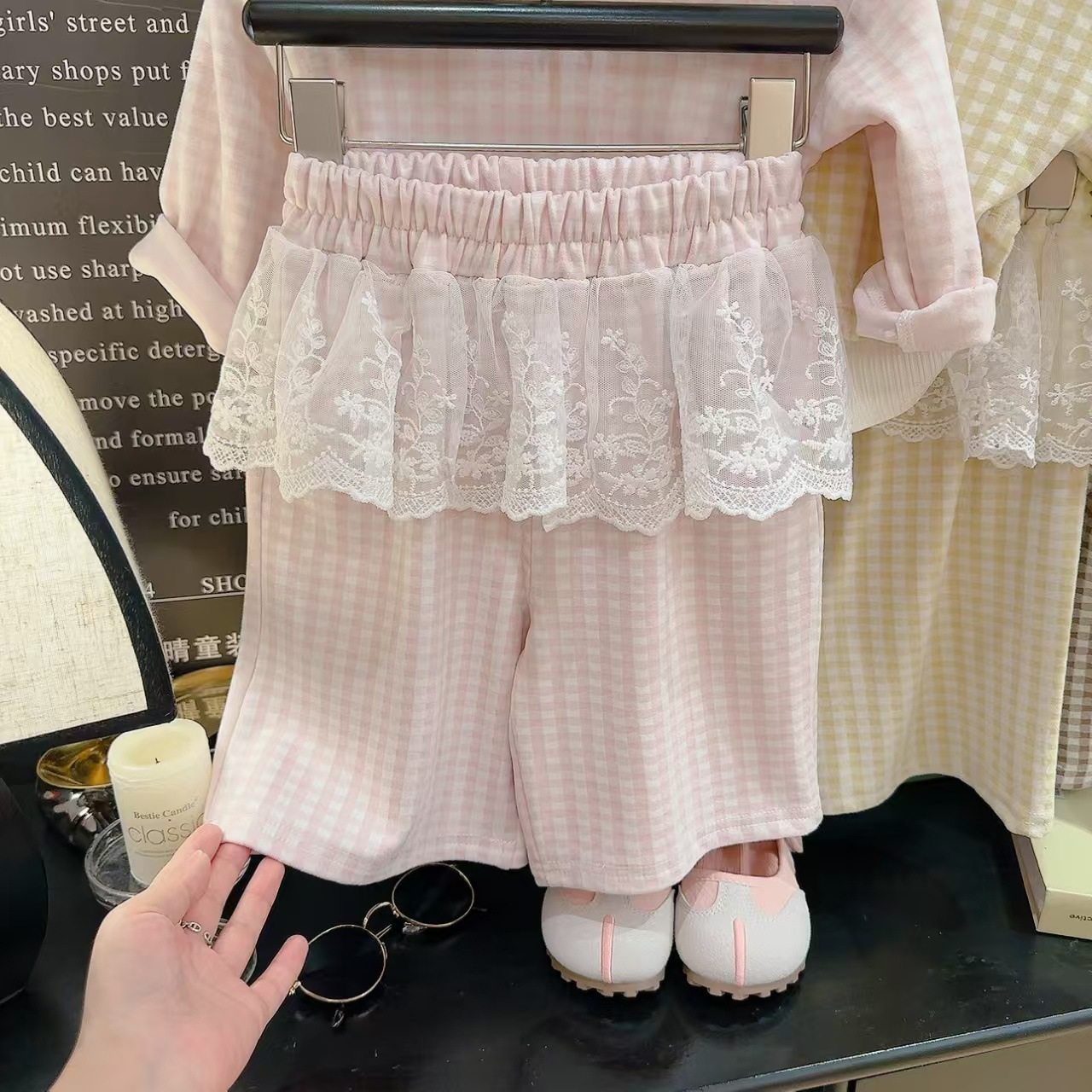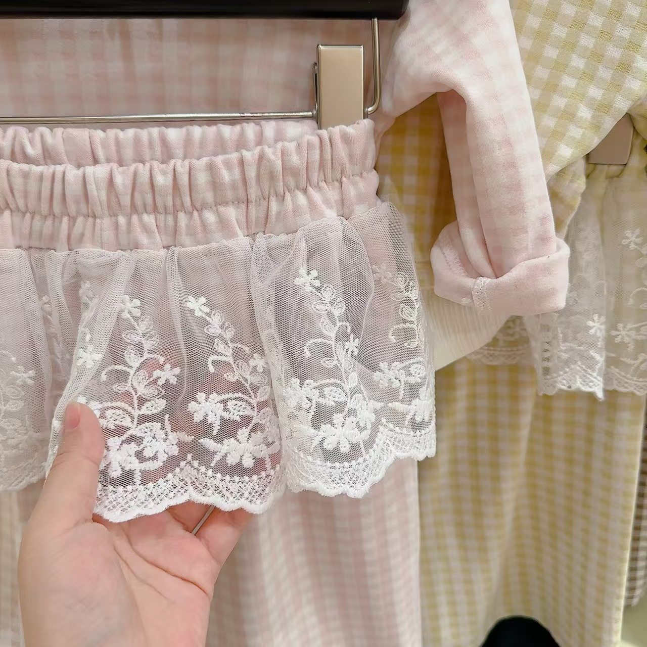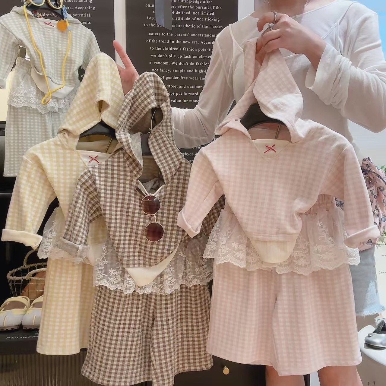 Herbst-Neuheit-vielseitige Spitzenrüschenhose & Langarm-Kapuzen-Süße-Dame-Karo-Top-Spitzen-Set